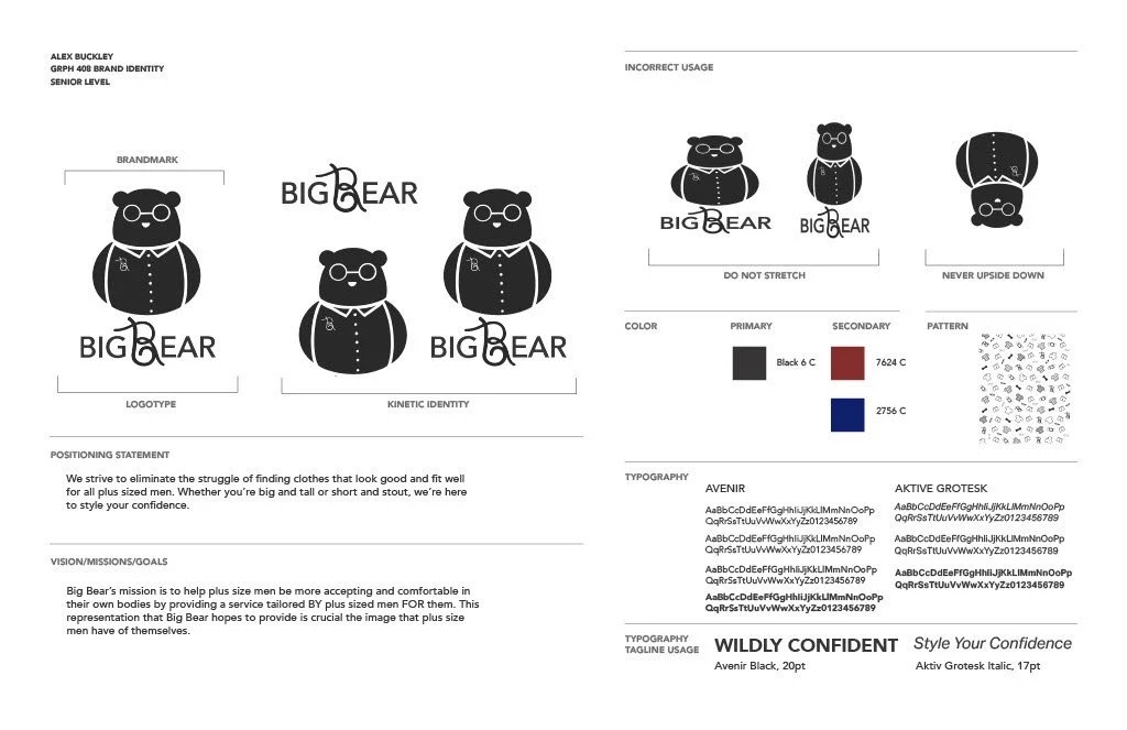 From a bold, adaptable logo to a refined color palette and typography system, every element was designed for consistency and impact across digital, print, and environmental applications. The final guidelines ensure that no matter where the brand appears - on a storefront sign, a business card, or a social post, it speaks with the same confident, recognizable tone. This project meant a lot to me as it was a mission that was personal to me and my struggles with clothing as well.